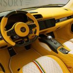 打开蝴蝶门,Mansory 直接帮 MC20 重新设计了内装风格,采用黄 + 黑配色,并且其座椅,门板以及脚垫都导入了质感更好的布质,整个内装氛围超级高级,也很战斗,同时也彰显了 Mansory 的特殊身份!