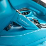 打开车门来到内饰,Mansory 对 Urus 的内饰升级也是毫不手软,全车的饰板以及皮革都进行了重新设计和升级,质感更好!整个内装都采用蓝绿色的配色 + 白色缝线,以及刻印 Y 型的黑色饰板,再加上 Urus 原装具备多功能运动方向盘 + 许多高级配备,因此整体非常战斗和科技感。值得一提的是因为成了双门 SUV,所以在前排座椅上多了一个折叠功能,以便乘客可以更方便地去到后排座椅!