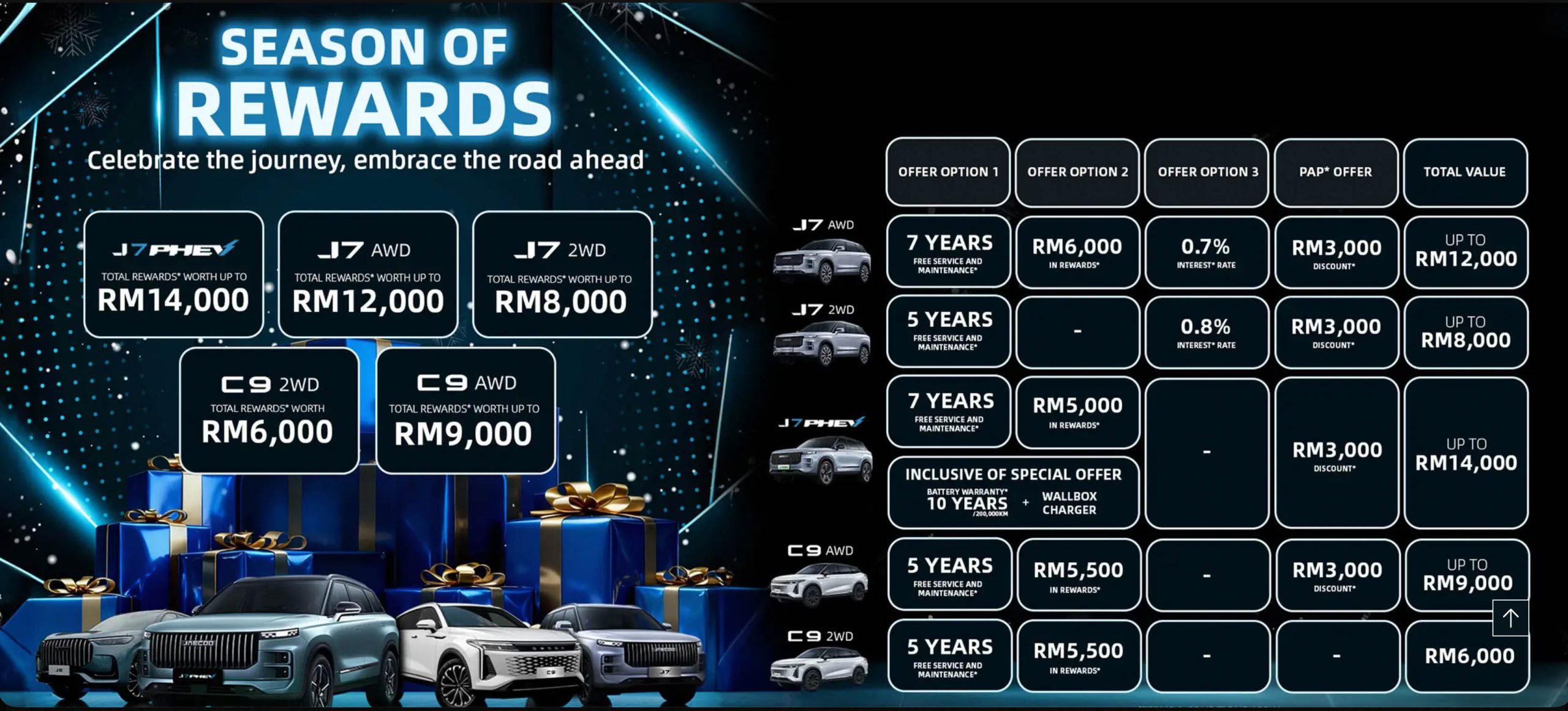 随着年末临近,Jaecoo Malaysia 推出全新 “Season of Rewards” 年终购车优惠活动,旗下的 J7 车系和 Omoda C9 车系都有一定的优惠!你也可根据需求灵活选择 Offer Package,比如:免费服务与保养、利率优惠、现金折扣及 Wallbox 充电器,总价值最高可达 RM14,000!