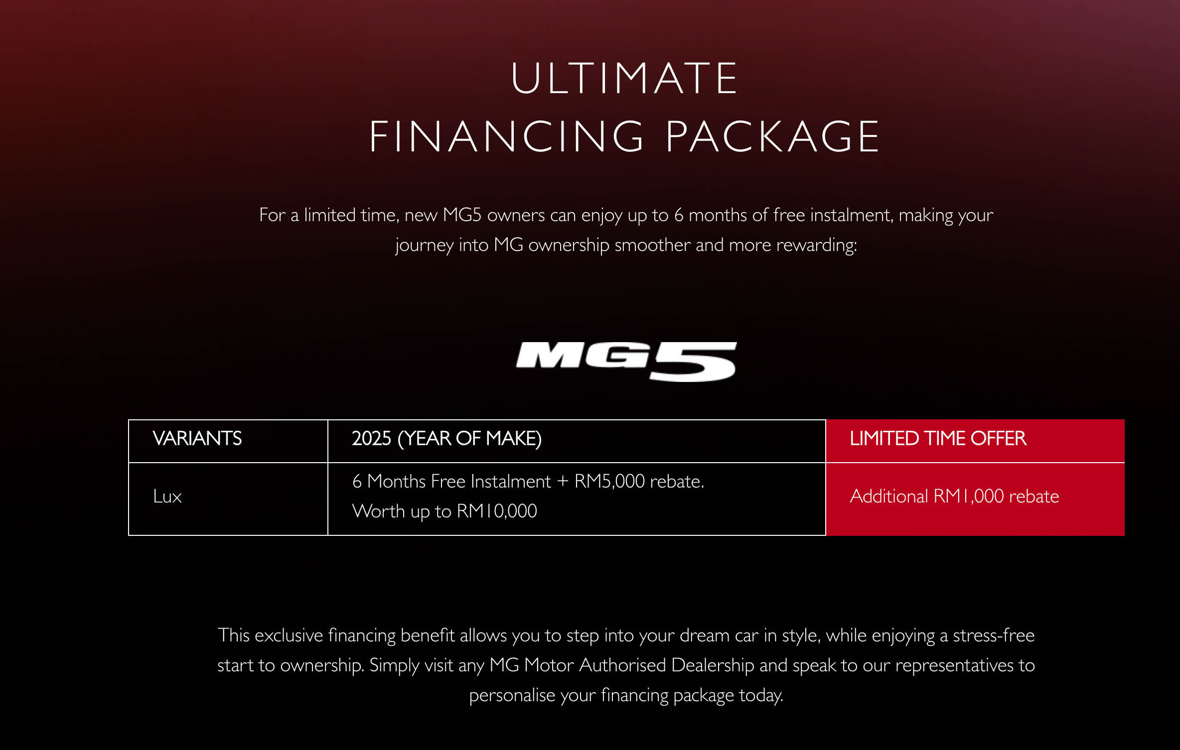 MG 5:RM93,900(车价优惠 6 个月 Free Installment + RM5,000 Rebate *总值 RM10,000 + 限时优惠 RM1,000)