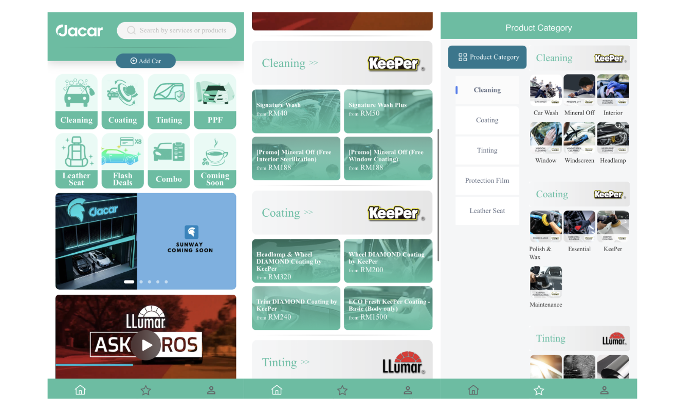 为什么选择 JaCar? JaCar 拥有日本顶尖的 KeePer 洗车技术,整个洗车过程极其讲究,使用 8 种不同专用毛巾清洗和擦拭,避免交叉污染,所有员工均经过日本专业培训认证,手艺精湛。除了洗车,JaCar 还提供全方位汽车护理服务,包括抛光 (Polish)、镀膜 (Coating)、矿物洗车 (Mineral Wash),以及隔热膜 (Tint) 和漆面保护膜 (PPF),全部采用国际知名品牌 Llumar。通过智能 JaCar App,你可以透明查价、轻松预约、实时监控护理过程,还能查看施工前后的对比照片,效果一目了然,让护理爱车既方便又安心。