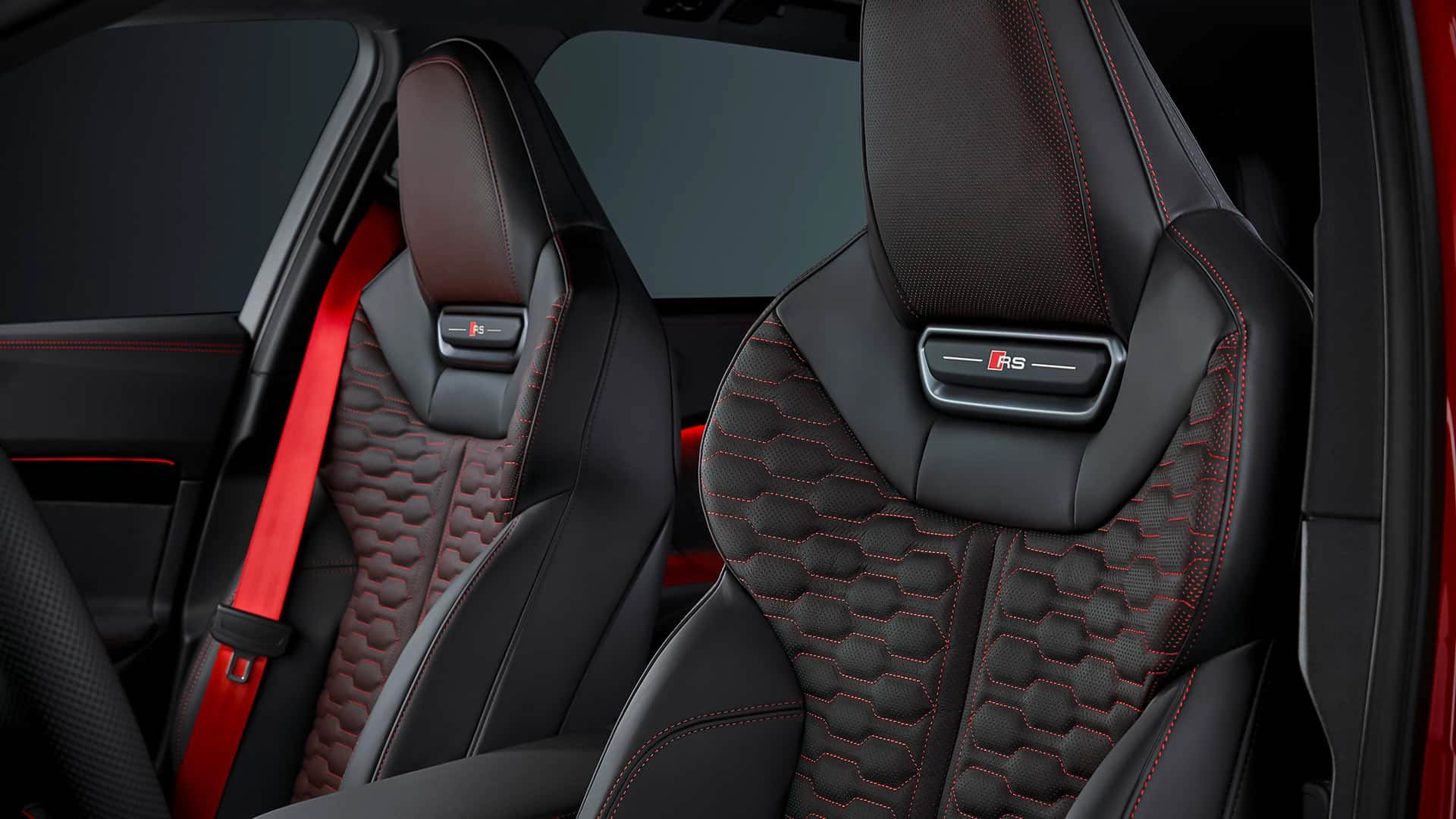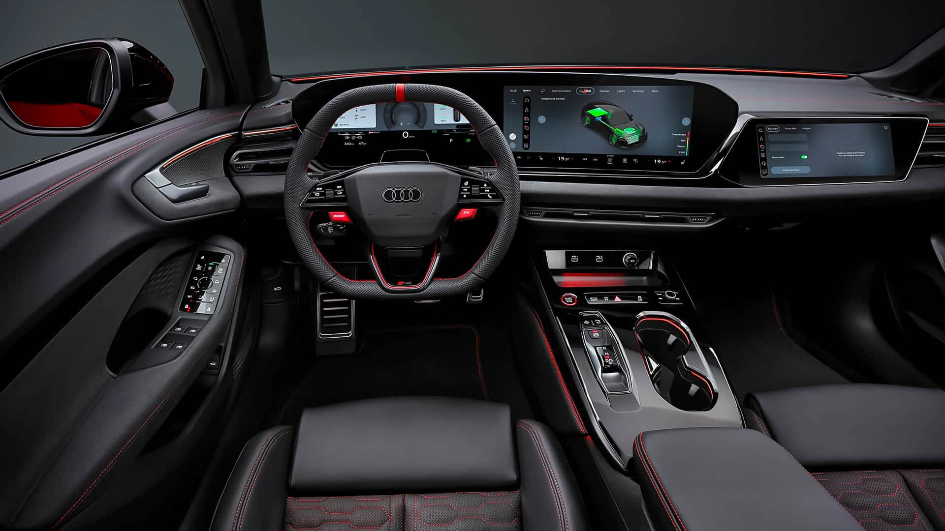 内饰延续了 A5 的三联屏布局,但加入了大量 RS 专属元素: