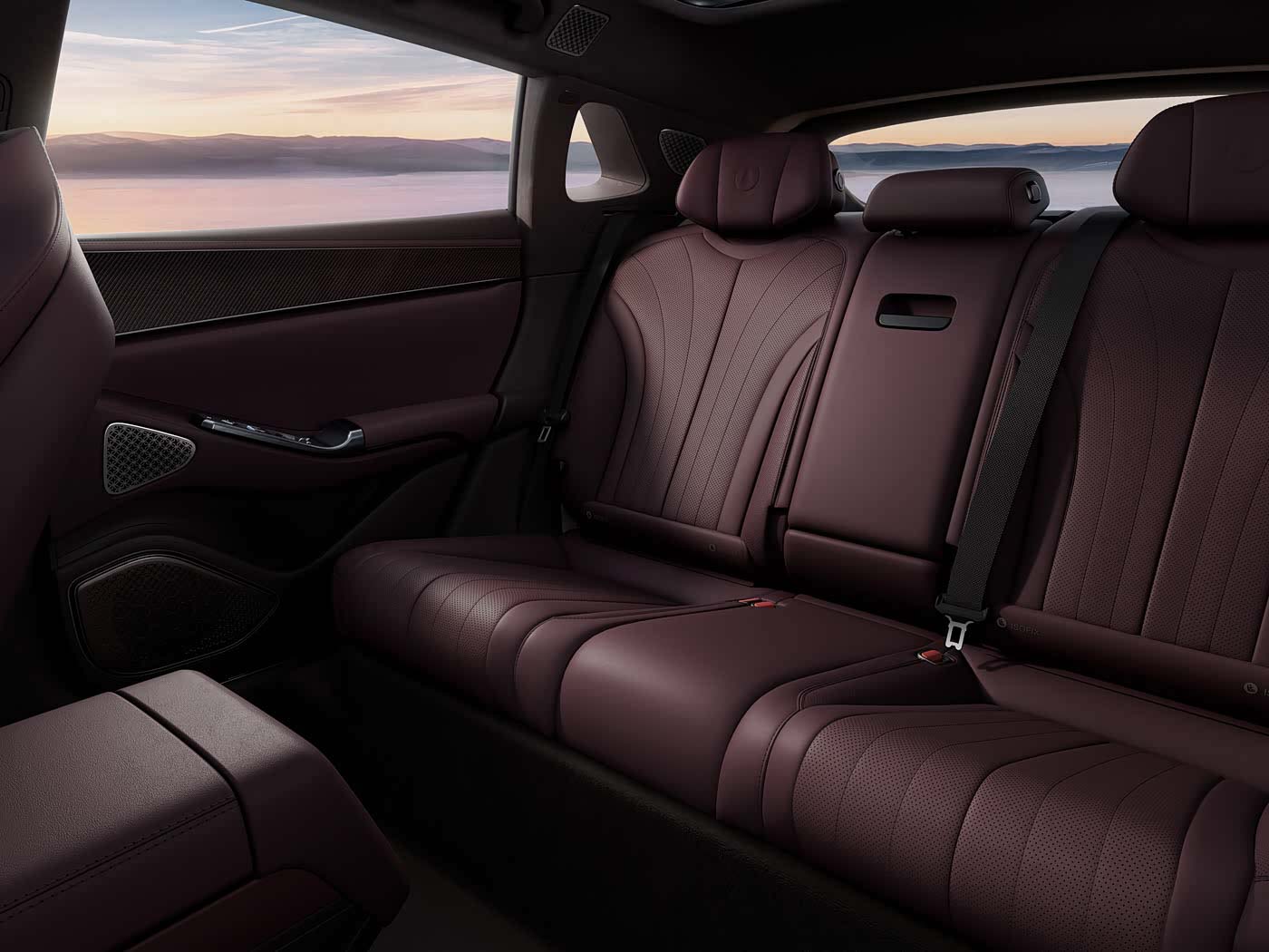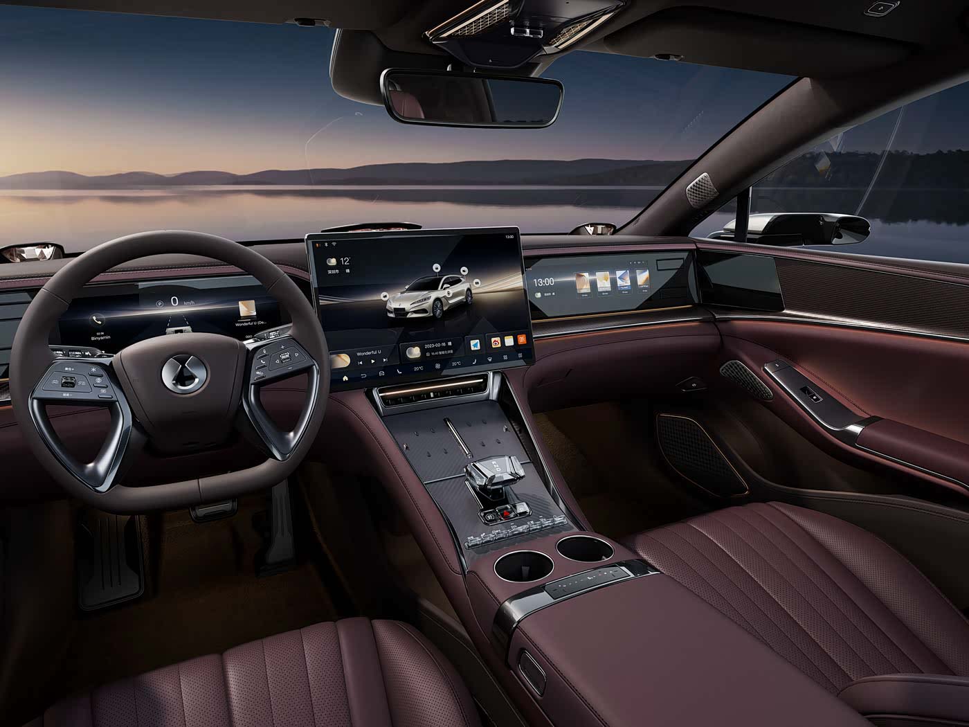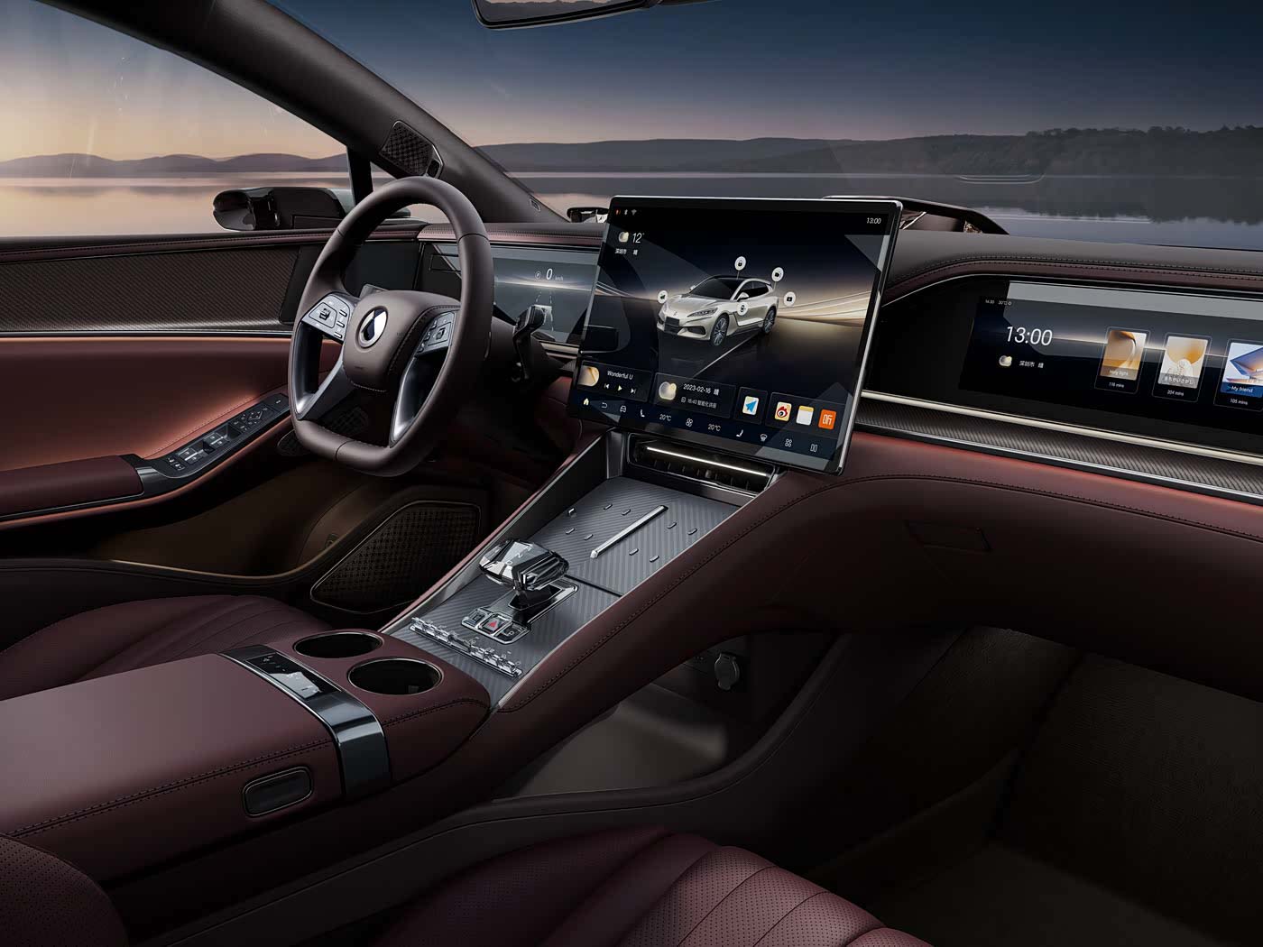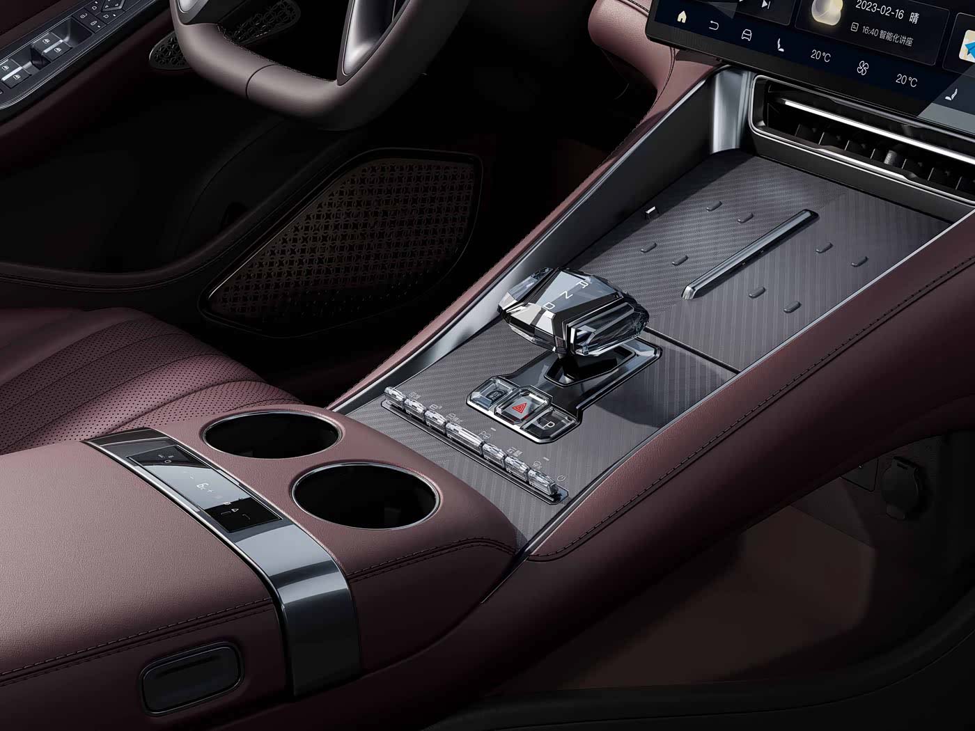 进入车内,Z9 GT 主打豪华高级风格,中控台采用三屏布局,包括13.2 寸全液晶仪表、17.3 寸中控屏和 13.2 寸娱乐屏。中控台下方有50W 无线充电。同时还包括全景玻璃天窗、20 扬声器音响系统、红色的电动座椅(通风、加热与按摩功能),EV 版车前还有 53L的储物空间,不用担心储物空间不够。