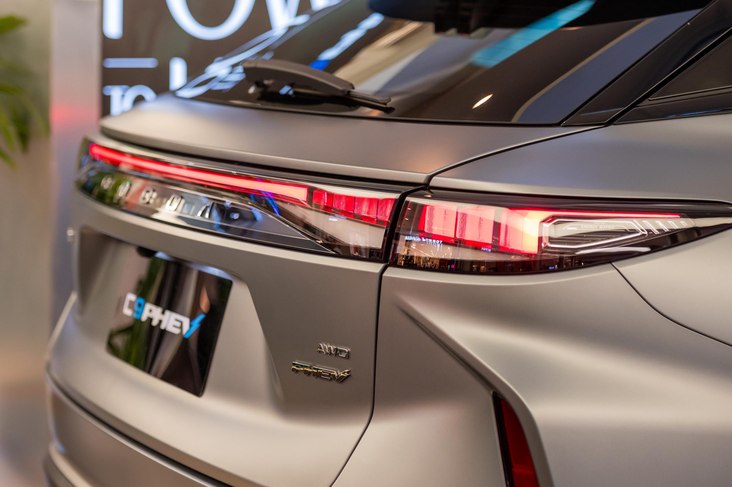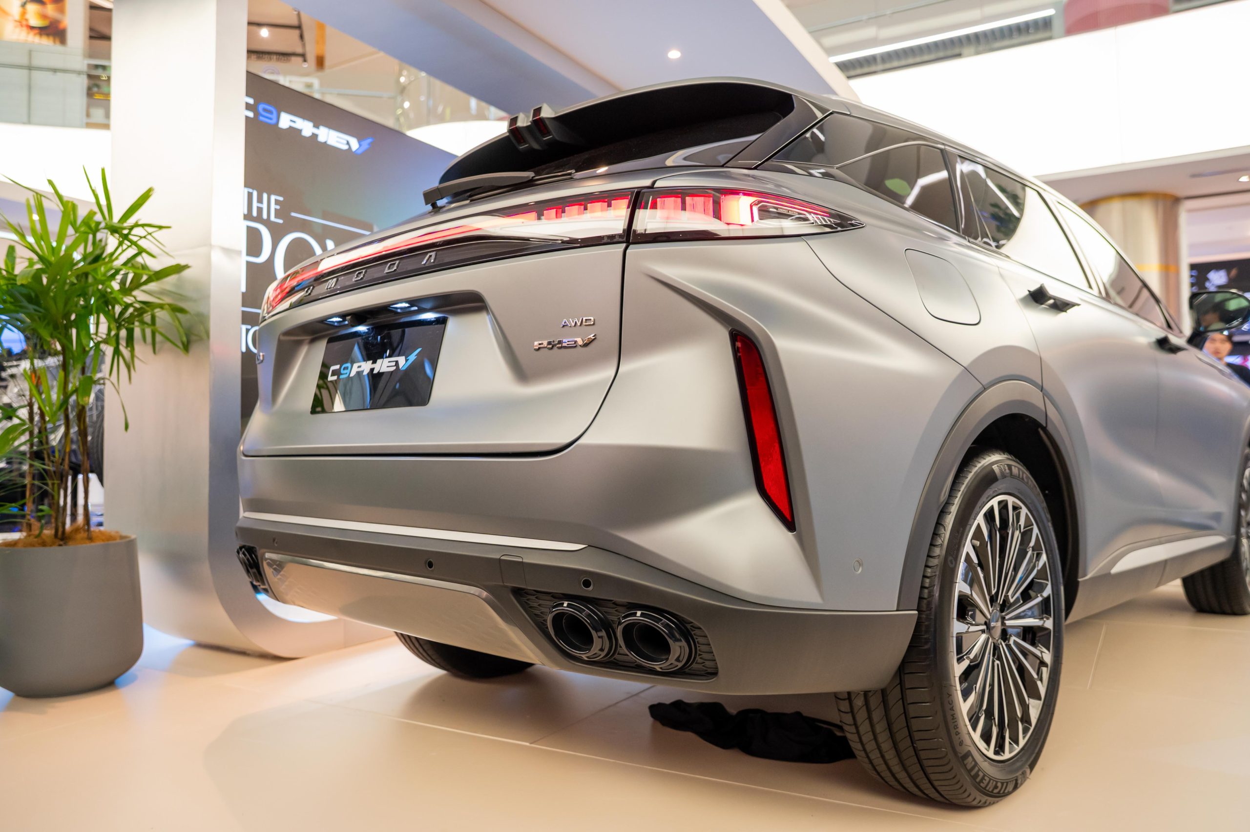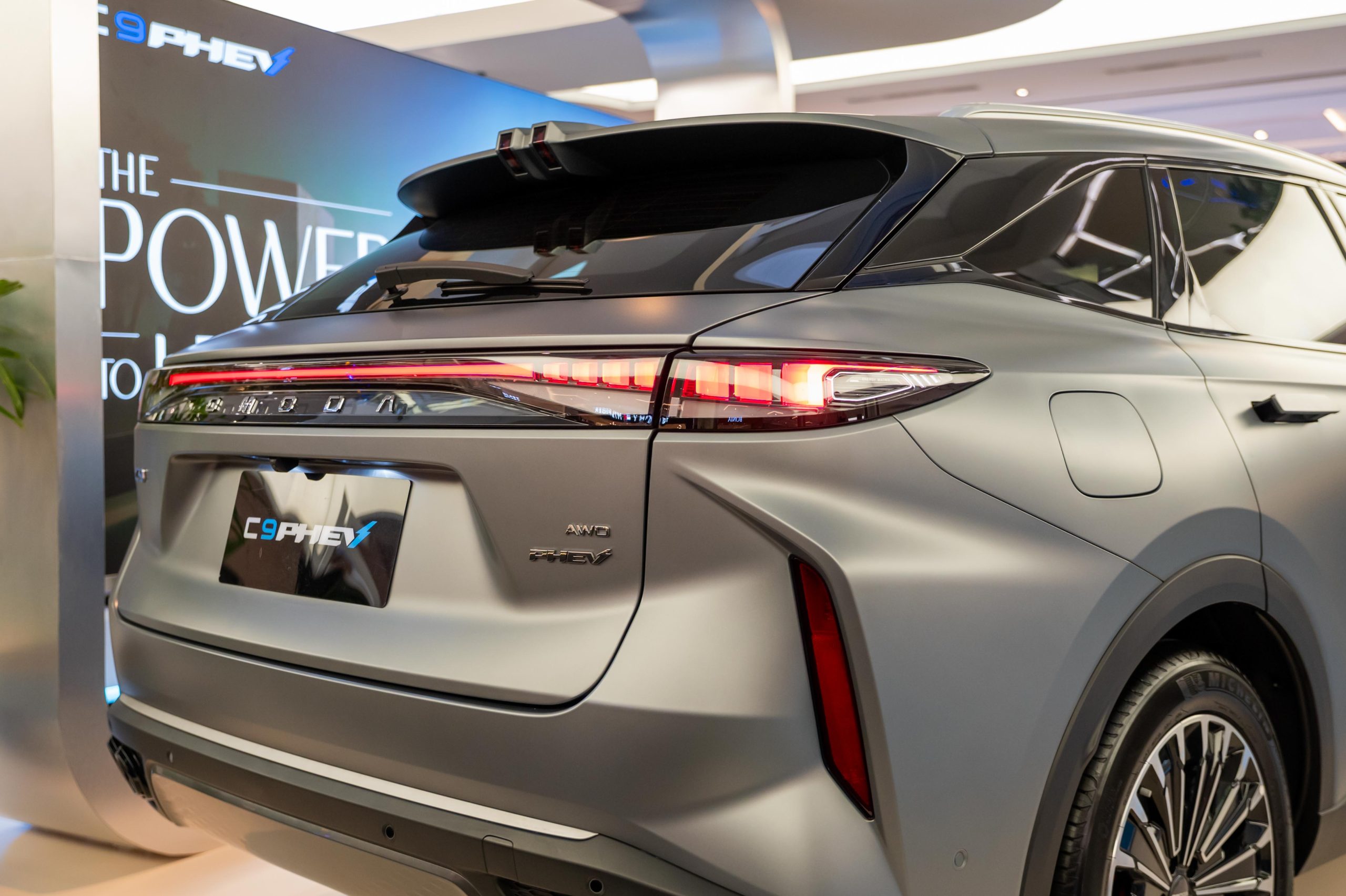 来到外观方面,和 C9 外观基本一致,C9 PHEV 车头采用超大的菱形进气口设计搭配 L Shape 的头灯组。车侧采用 20寸轮圈(Michelin e-Primacy 245/50R2)搭配隐藏式门把、悬浮式车顶,车尾一样采用贯穿式熏黑尾灯和双边双出排气设计,整体外观很有未来感,尤其是车头非常锐利(晚上看真的超帅)。车身尺寸方面,长 4,775 mm、宽 1,920 mm、高 1,671 mm,轴距达到 2,800 mm,保证了 D-Segment SUV 气场和空间表现。