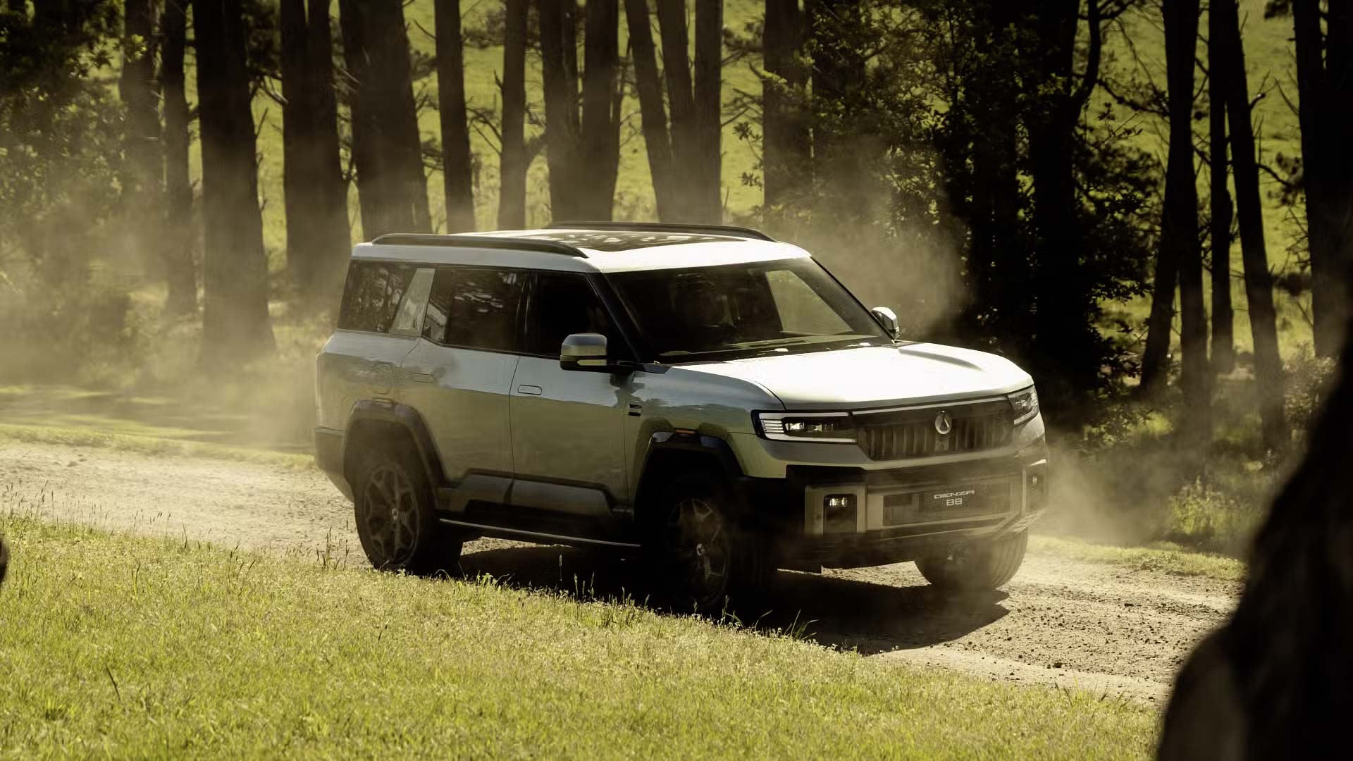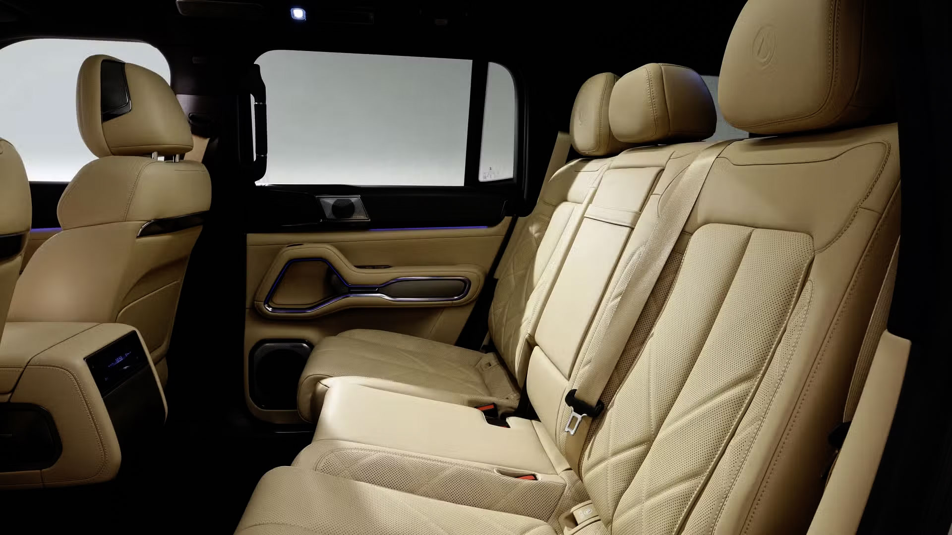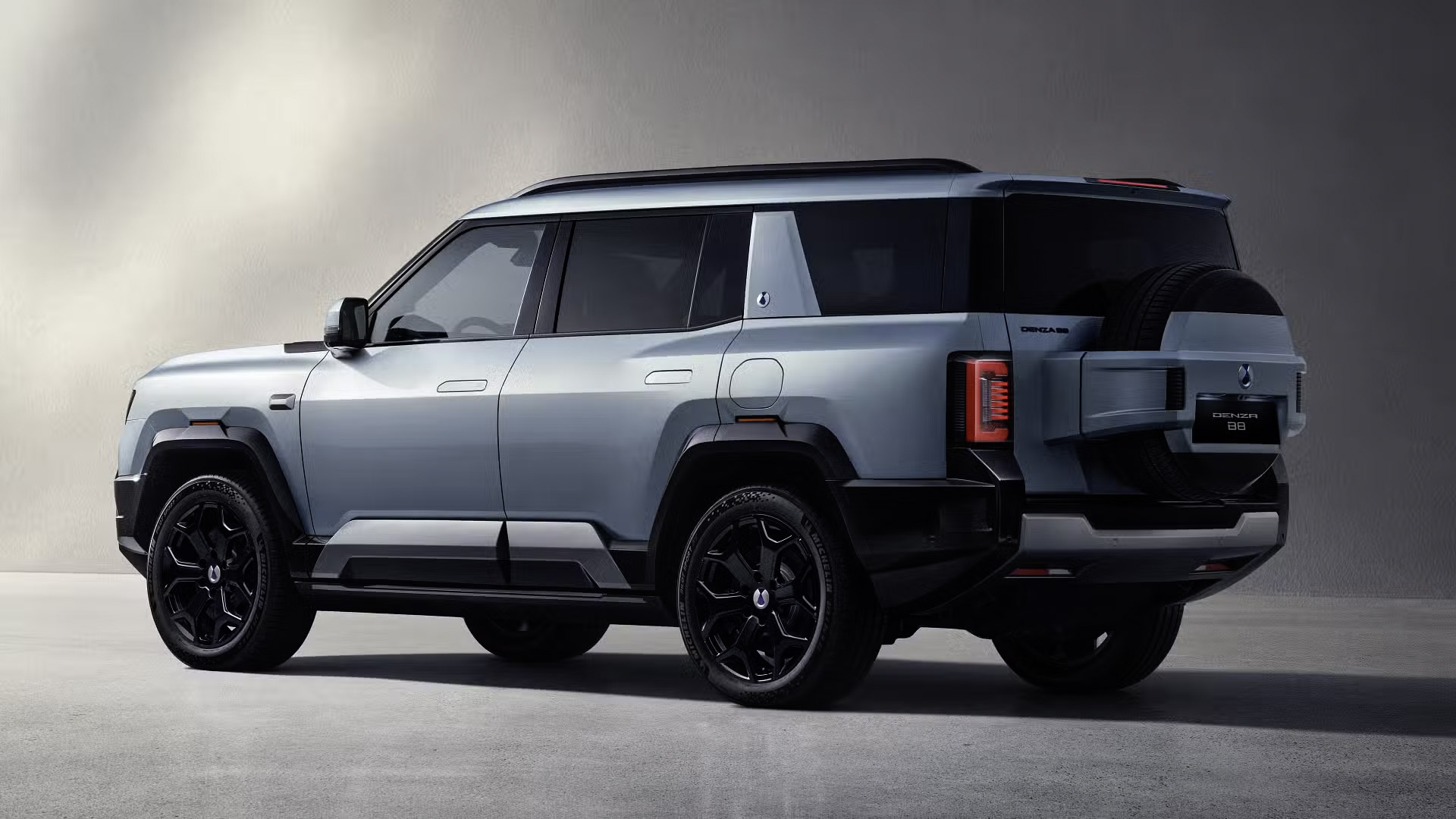 再来是外观,B8 整体带有“坦克”风格,车头采用半封闭式格栅设计,上部为黑色饰板连接着两侧C型日行灯,下方则采用网格状进气口,车侧隐藏式式门把➕20寸轮圈,车尾部分,采用C型立体尾灯组、外挂式全尺寸备胎以及带有银色防擦护板的后保险杠,整体属于更硬派的“方盒子”造型。