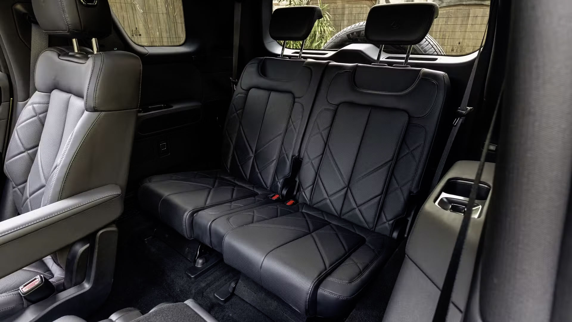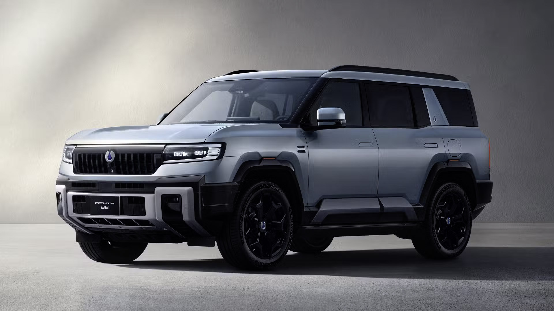 再来是外观,B8 整体带有“坦克”风格,车头采用半封闭式格栅设计,上部为黑色饰板连接着两侧C型日行灯,下方则采用网格状进气口,车侧隐藏式式门把➕20寸轮圈,车尾部分,采用C型立体尾灯组、外挂式全尺寸备胎以及带有银色防擦护板的后保险杠,整体属于更硬派的“方盒子”造型。